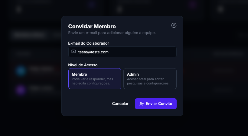 | Admin | Pode criar/editar pesquisas, ver resultados e convidar membros. |