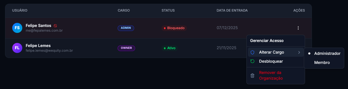 - Remover Membro: Excluir permanentemente o vínculo com a organização.