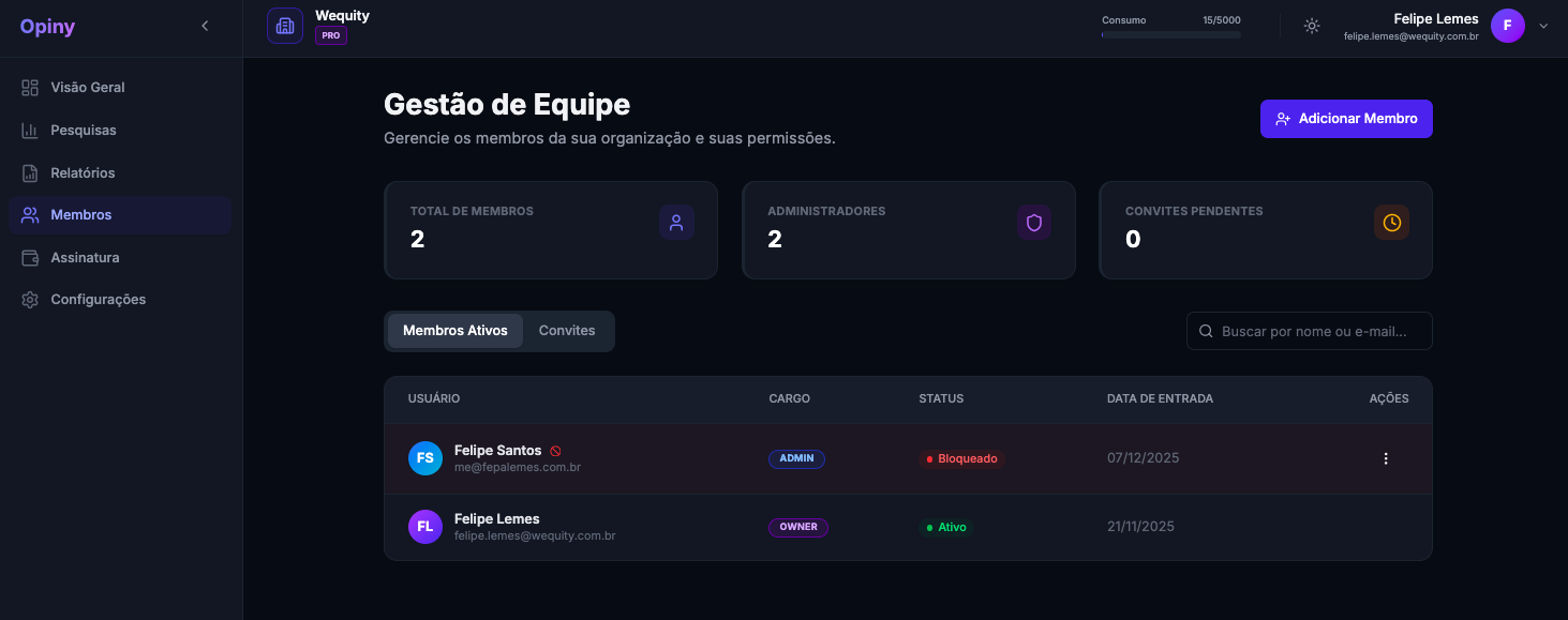 - Membros Ativos: Usuários que já aceitaram o convite.