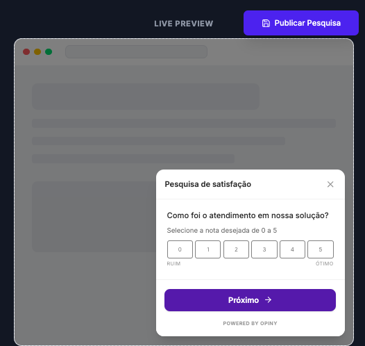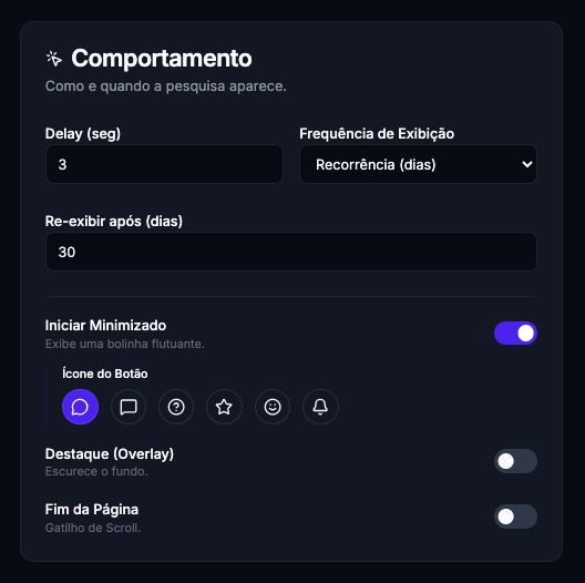 Dica de Conversão: Para pesquisas de satisfação geral, um delay de 5 a 10 segundos costuma performar melhor do que a exibição imediata.