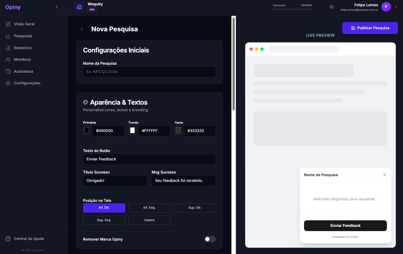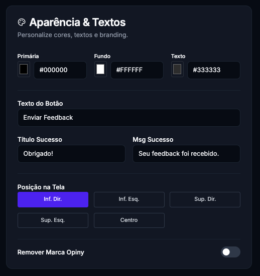 - Remover Branding: Usuários PRO podem ocultar a marca “Powered by Opiny” para uma experiência white-label.