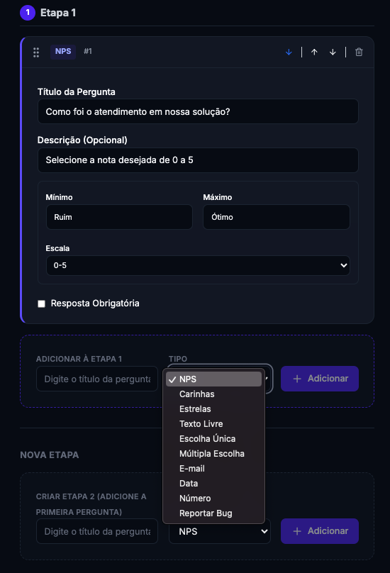 - Recorrência: Defina se o usuário verá a pesquisa apenas uma vez, sempre, ou após um intervalo de dias (Cooldown).