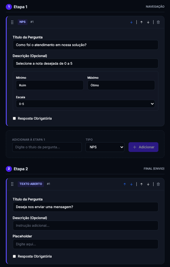 Para feedbacks qualitativos detalhados. Configure placeholders personalizados.