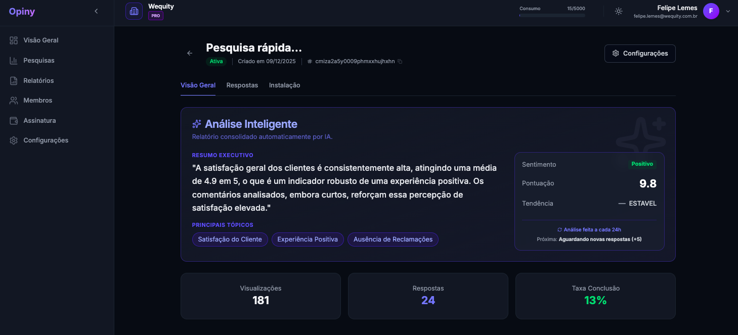 - Análise de IA: Um resumo executivo gerado automaticamente que interpreta o “tom” geral dos seus clientes e lista os tópicos mais comentados (ex: “Elogios à entrega”, “Reclamações sobre preço”).