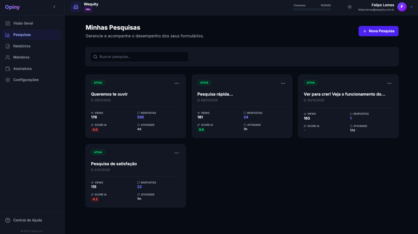 Ao clicar em “Pesquisas” no menu lateral, você verá todos os seus formulários organizados em cards.